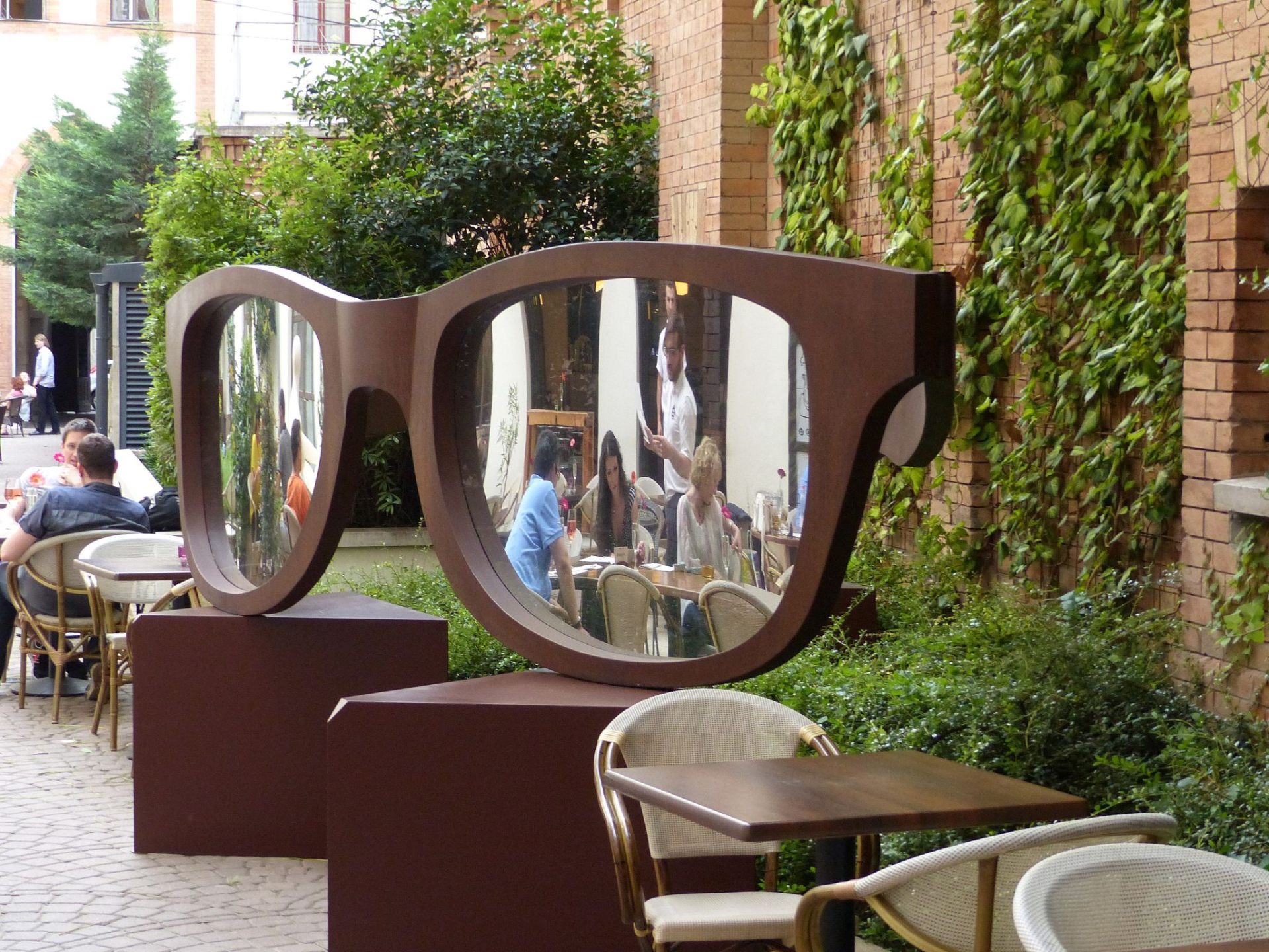 Image: a giant pair of sunglasses sculpture in a leafy courtyard café – diners reflected in the mirrored lenses.